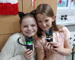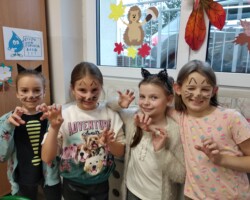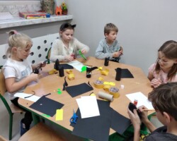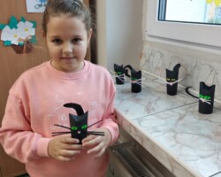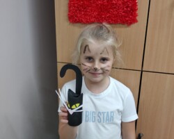 17 listopada w kalendarzu świąt nietypowych przypada Dzień Czarnego Kota. Była to okazja do rozmów o przesądach. Dyskutowaliśmy nad tym, czy czarny kot przynosi pecha, a czterolistna koniczyna szczęście. Doszliśmy do wniosku, że jednak nie. Dowiedzieliśmy się, że w niektórych krajach np. we Francji ludzie wierzą, że czarny kot przynosi szczęście. Poznaliśmy także 7 ciekawostek o czarnych kotach. W ramach zajęć plastycznych wykonaliśmy czarne koty z papierowej rolki oraz malowane techniką kropkową. Prace można podziwiać na korytarzu. Na zakończenie zajęć