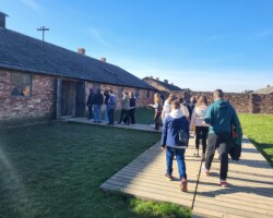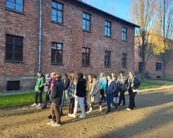 Mogliśmy poruszać się po większości terenów byłego obozu zagłady. Zaraz po przejściu przez bramę, na której widniał napis „Arbeit macht frei” („praca czyni wolnym”), odwiedziliśmy blok, w którym znajdowały się fotografie więźniów oraz ich rzeczy osobiste i ubrania. Zwiedziliśmy także wnętrze bloku 11., tzw. Bloku Śmierci, gdzie w piwnicy mieściły się komory gazowe. Znajdowała się tam także sala posiedzeń sądu doraźnego gestapo, gdzie podejmowano decyzje o karze śmierci. Mieliśmy okazję zobaczyć krematoria oraz Ścianę Śmierci przy której zapaliliśmy znicz ku pamięci ofiar. Kolejnym punktem wycieczki było zwiedzanie Auschwitz II- Birkenau, gdzie na blisko 200 ha zachowały się ruiny komór gazowych i prymitywne baraki dla więźniów. Wszystko ogrodzone zostało kilometrami obozowego ogrodzenia. Udaliśmy się pod Międzynarodowy Pomnik Ofiar Obozu, który znajduje się w centralnym punkcie obiektu. Następnie zwiedziliśmy wnętrze baraków mieszkalnych.
