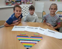 16 listopada obchodziliśmy Międzynarodowy Dzień Tolerancji. Podczas zajęć świetlicowych obejrzeliśmy filmik edukacyjny poświęcony temu świętu. Wyjaśniliśmy sobie znaczenie słowa „tolerancja”. Szukaliśmy różnic i podobieństw miedzy nami. Świetliczaki wysłuchały także opowiadania tematycznego Diany Hsu pt. „Smok Josh”, które później w ramach konkursu zilustrowały.