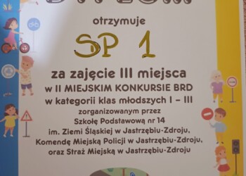 Miło nam jest poinformować, iż 09 kwietnia w Miejskim Konkursie „Bezpieczeństwo Ruchu Drogowego” zorganizowanym przez Szkołę Podstawową nr 14 w Jastrzębiu-Zdroju we współpracy z Komendą Miejską Policji oraz Strażą Miejską w Jastrzębiu-Zdroju nasza szkoła zdobyła III miejsce. Z tego miejsca Dziękujemy również i Gratulujemy uczniom klasy I, II, III czyli Lilianie, Marcinowi oraz Bartoszowi za ten wspaniały wynik.