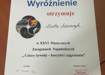 25 stycznia br. uczniowie naszej szkoły w składzie: Marta Adamczyk, Piotr Rychły i Aleksandra Koszewska wzięli udział w XXVI MIEJSKICH PLASTYCZNYCH ZMAGANIACH NAJMŁODSZYCH. Konkurs pod hasłem : „Cztery żywioły-korzyści i zagrożenia” okazał się szczęśliwy dla dwojga z nich. Wyróżnienie otrzymali: z klasy I – Marta Adamczyk oraz z klasy III – Aleksandra Koszewska. Gratulujemy i życzymy dalszych sukcesów!