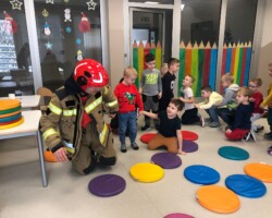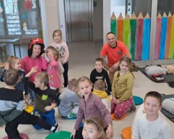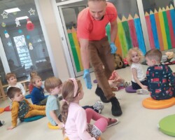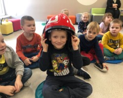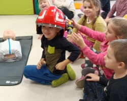 Dnia 13.12.2022 do przedszkolaków przybył niezwykły gość, który przy wspólnej zabawie uczył dzieci udzielania pierwszej pomocy oraz bezpiecznej ewakuacji w razie pożaru. Pan Bartłomiej Sępiak, bo o nim mowa, jest zawodowym ratownikiem medycznym oraz strażakiem. Oprócz praktycznych zajęć, przybliżył przedszkolakom pracę strażaka i ratownika medycznego. Dzieci mogły sprawdzić wytrzymałość ubrania ochronnego oraz zobaczyć jak dobrze prezentują się w hełmie strażackim.