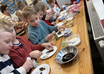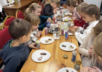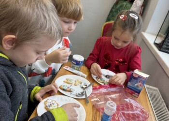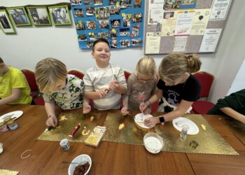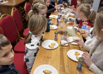 Uczniowie klasy 2 a oraz dzieci z grupy „Motylki” mieli okazję uczestniczyć w niezwykłych warsztatach przygotowanych przez Panie z Koła Gospodyń Wiejskich. Pod czujnym okiem gospodyń dzieci własnoręcznie wypiekały świąteczne ciasteczka – wałkowały ciasto, wykrawały przeróżne kształty. Po upieczeniu ciasteczek przyszedł czas na ich dekorowanie. Kolorowe lukry, posypki i inne ozdoby pobudziły dziecięcą kreatywność i zamieniły ciasteczka w małe dzieła sztuki. Na koniec wszyscy mieli możliwość spróbowania swoich cukierniczych dzieł sztuki. Radość z własnoręcznie wykonanych ciasteczek i świąteczna atmosfera sprawiły, że ten dzień na długo pozostanie w pamięci uczestników. Dziękujemy Paniom z Koła Gospodyń Wiejskich za ich gościnność i zaangażowanie!