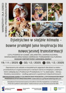 Serdecznie zapraszamy na bezpłatne warsztaty dla dzieci w wieku przedszkolnym organizowane w naszej placówce. Zajęcia realizowane są w ramach Inicjatywy Lokalnej o nazwie „Dziedzictwo w służbie klimatu – dawne praktyki jako inspiracja dla nowoczesnej transformacji”. Jest ona finansowana ze środków Unii Europejskiej w projekcie “Pod skrzydłami Jastrzębia” realizowanym przez Stowarzyszenie EBI.