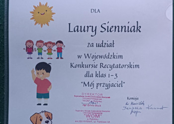 7 czerwca br. odbył się w Rybniku Wojewódzki Konkurs Recytatorski klas 1-3 pod hasłem: „ Mój przyjaciel”. Miasto Jastrzębie-Zdrój reprezentowało troje zwycięzców Konkursu Miejskiego, w tym nasza drugoklasistka – LAURA SIENNIAK. Spośród uczestników całego regionu jury wyłoniło najlepszych recytatorów. Wśród nich znalazła się LAURA – uczennica klasy 2 b, która zdobyła WYRÓŻNIENIE w tymże konkursie.