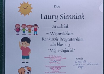 7 czerwca br. odbył się w Rybniku Wojewódzki Konkurs Recytatorski klas 1-3 pod hasłem: „ Mój przyjaciel”. Miasto Jastrzębie-Zdrój reprezentowało troje zwycięzców Konkursu Miejskiego, w tym nasza drugoklasistka – LAURA SIENNIAK. Spośród uczestników całego regionu jury wyłoniło najlepszych recytatorów. Wśród nich znalazła się LAURA – uczennica klasy 2 b, która zdobyła WYRÓŻNIENIE w tymże konkursie.