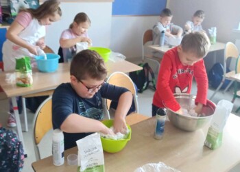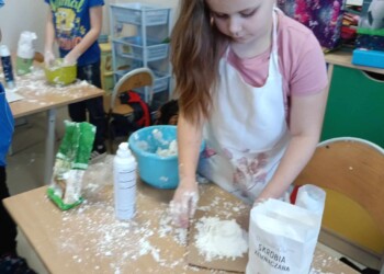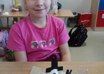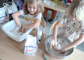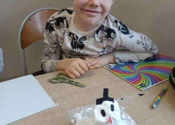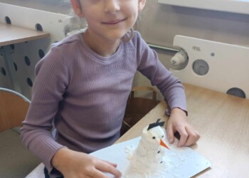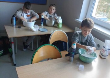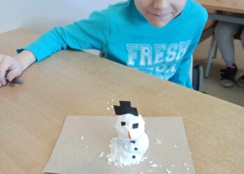 Na zajęciach sensorycznych przygotowanych przez wychowawczynię, uczniowie klasy 1 b mimo braku śniegu za oknem ulepiły swoje bałwanki. Sypki, sztuczny śnieg stworzony z mąki oraz pianki do golenia okazał się wspaniałą alternatywą dla naturalnego, białego puchu. Dzieci miały mnóstwo zabawy podczas pracy plastycznej, a końcowe prace wniosły zimową atmosferę do klasowej sali.